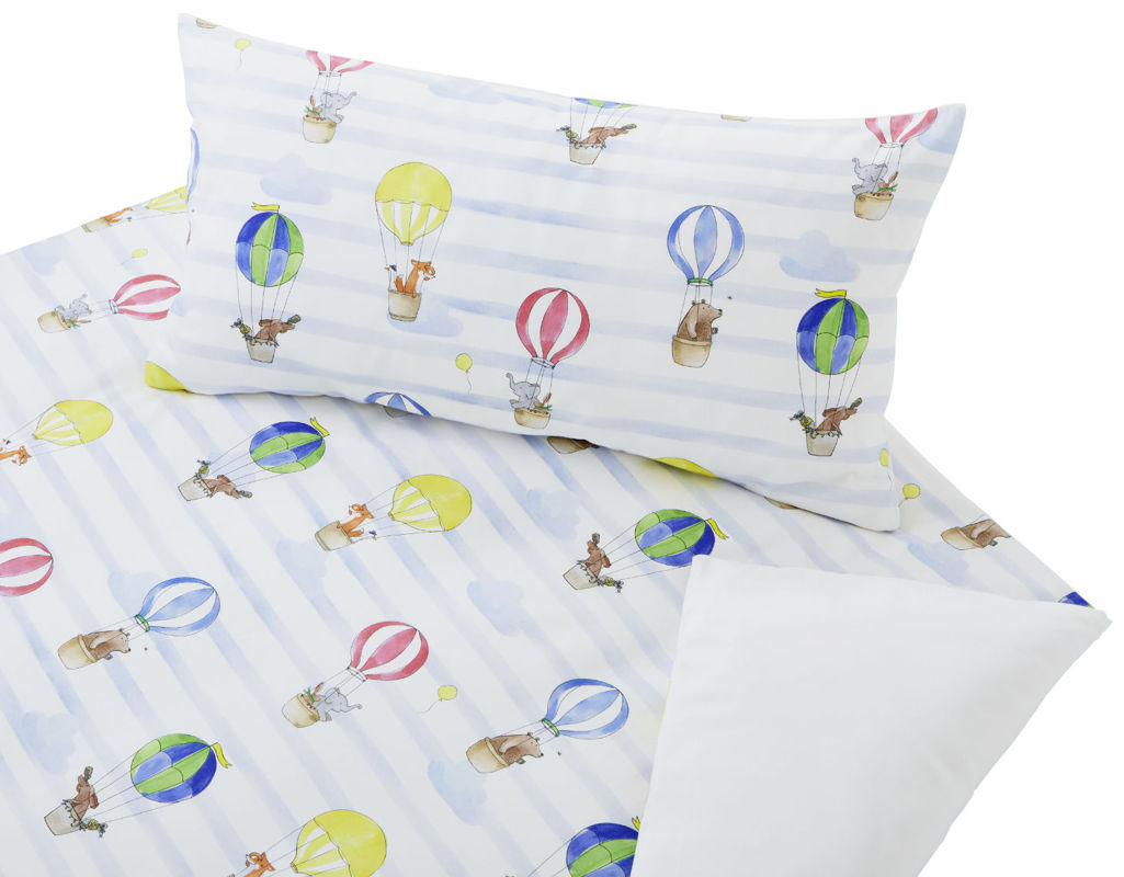 Bunte Heißluftballone nehmen Dich mit in eine abenteuerliche Traumwelt. Mit fröhlichen Tieren geht es auf Entdeckungsreise quer durch die Lüfte. Welches der Teams Elefant und Hase, Fuchs und Gans, Hund und Maus, Bär und Biene kommt zuerst ans Ziel? In bunten Aquarellfarben handgemalt, erfreut diese Bio-Kinderbettwäsche jedes Kinderherz. Dank der hochwertigen Bio-Baumwolle und ihrer umweltfreundlich, schonenden Verarbeitung ist die Bio-Bettwäsche aus Baumwollsatin optimal für die empfindliche Haut Ihres Kindes geeignet. Als Verschluss dient eine verdeckte Knopfleiste mit weißen, natürlichen Steinnuss-Knöpfen.