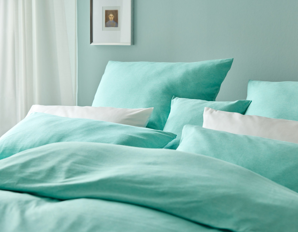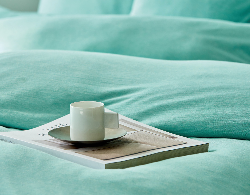 Bio Jersey-Bettwäsche Merelly in Urban Pool Türkis Garnitur aus Bio-Baumwolle von Cotonea Schlafzimmer mit Bio Jersey-Bettwäsche Merelly in Urban Pool Türkis von Cotonea Bio Jersey-Bettwäsche Merelly in Urban Pool Türkis von Cotonea aus Bio-Baumwolle Detailaufnahme Nahaufnahme Bio Jersey-Bettwäsche Merelly in Urban Blau von Cotonea aus Bio-Baumwolle Bio Jersey-Bettwäsche Merelly in Urban Pool Türkis mit Dekotasse