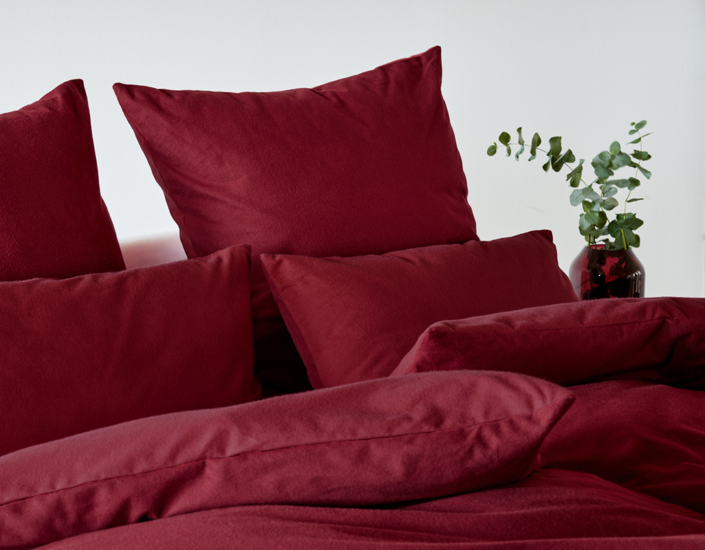 Garnitur Bio Bettwäsche Edel-Biber Kopfkissen und Bettdecke in Burgund Bett mit Bio Edel Biber Bettwäsche in Burgund von Cotonea